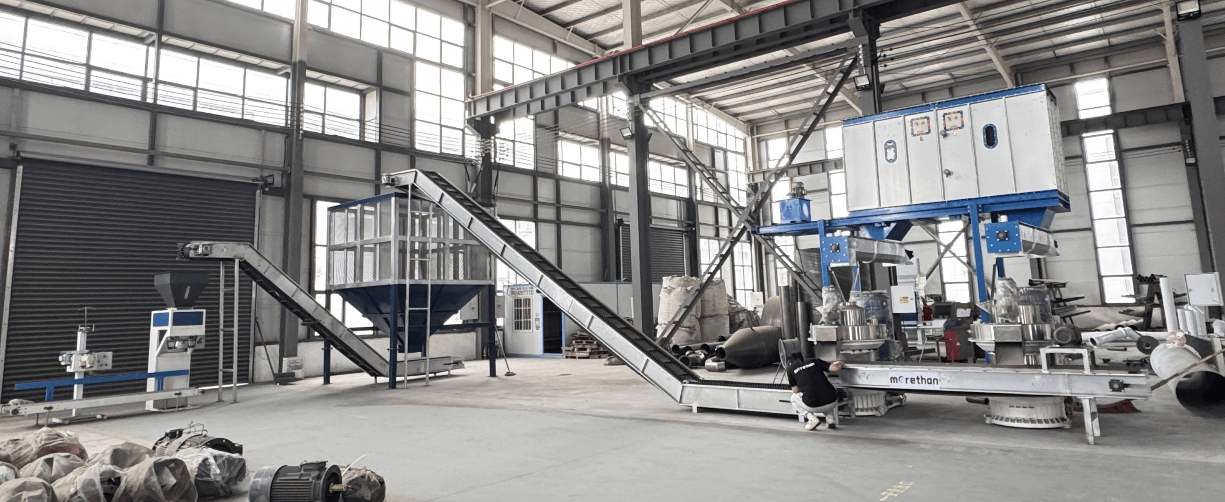 The hydraulic feeder evenly distributes material to two pellet mills, and includes a frequency converter cabinet, loading and unloading limiters, and dust explosion-proof windows.The pellet mill’s feed inlet and discharge hood are made of stainless steel, which is lightweight, durable, and corrosion-resistant. The die features a feeding hole-forming hole-forming hole-releasing hole design, minimizing forming and discharge resistance. Electrical components are from top-tier companies like Chint and Delixi, and the reducer uses heavy-duty hardened gears. The die is made of 20CrMnTi material with a carburized surface treatment to improve service life, and the pressure rollers are made of 65 manganese steel.