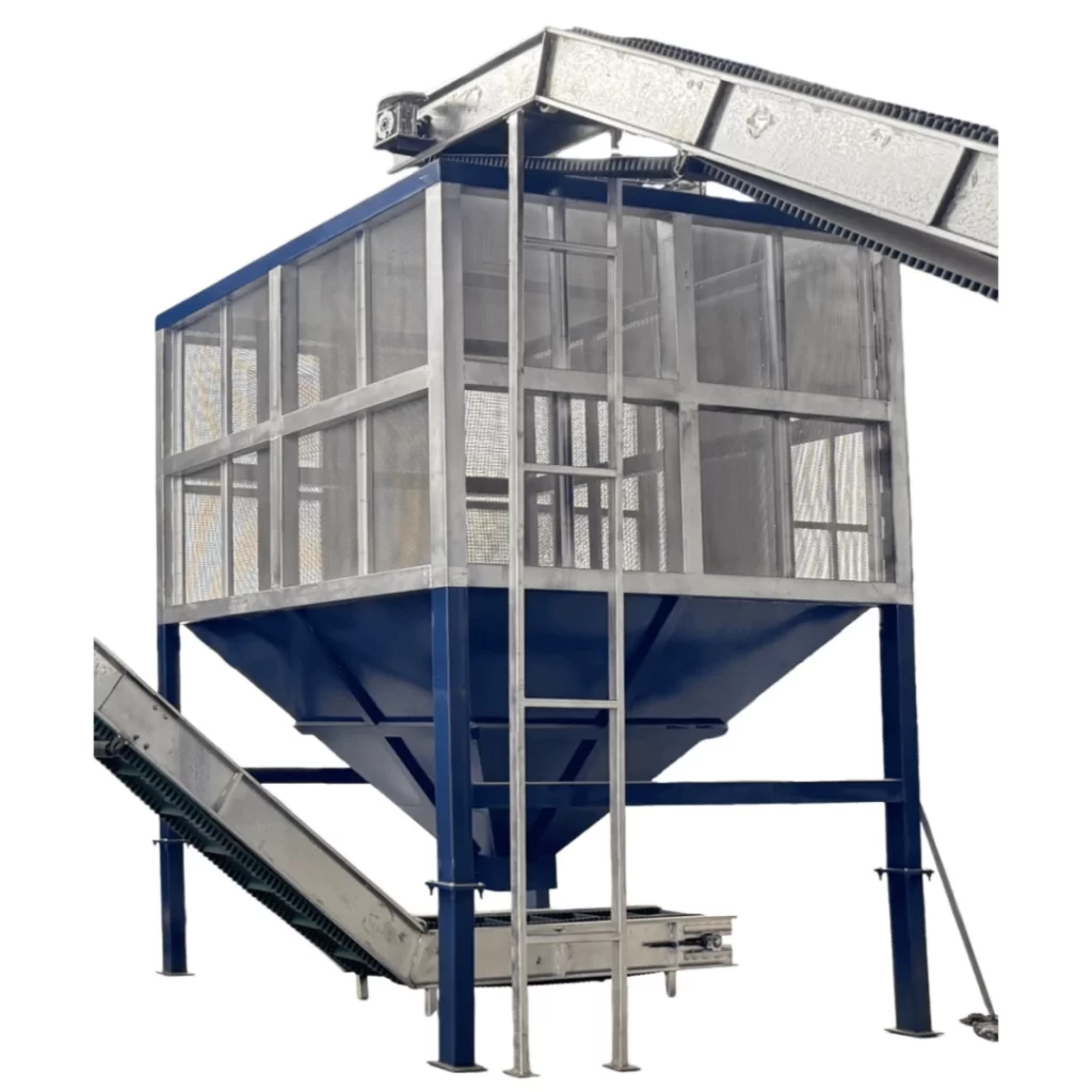 The storage silo is used to buffer the crushed wood chips. Variable frequency speed control can control the discharge. It is equipped with a variable frequency control cabinet, loading and unloading limiters, dust explosion-proof windows, etc.