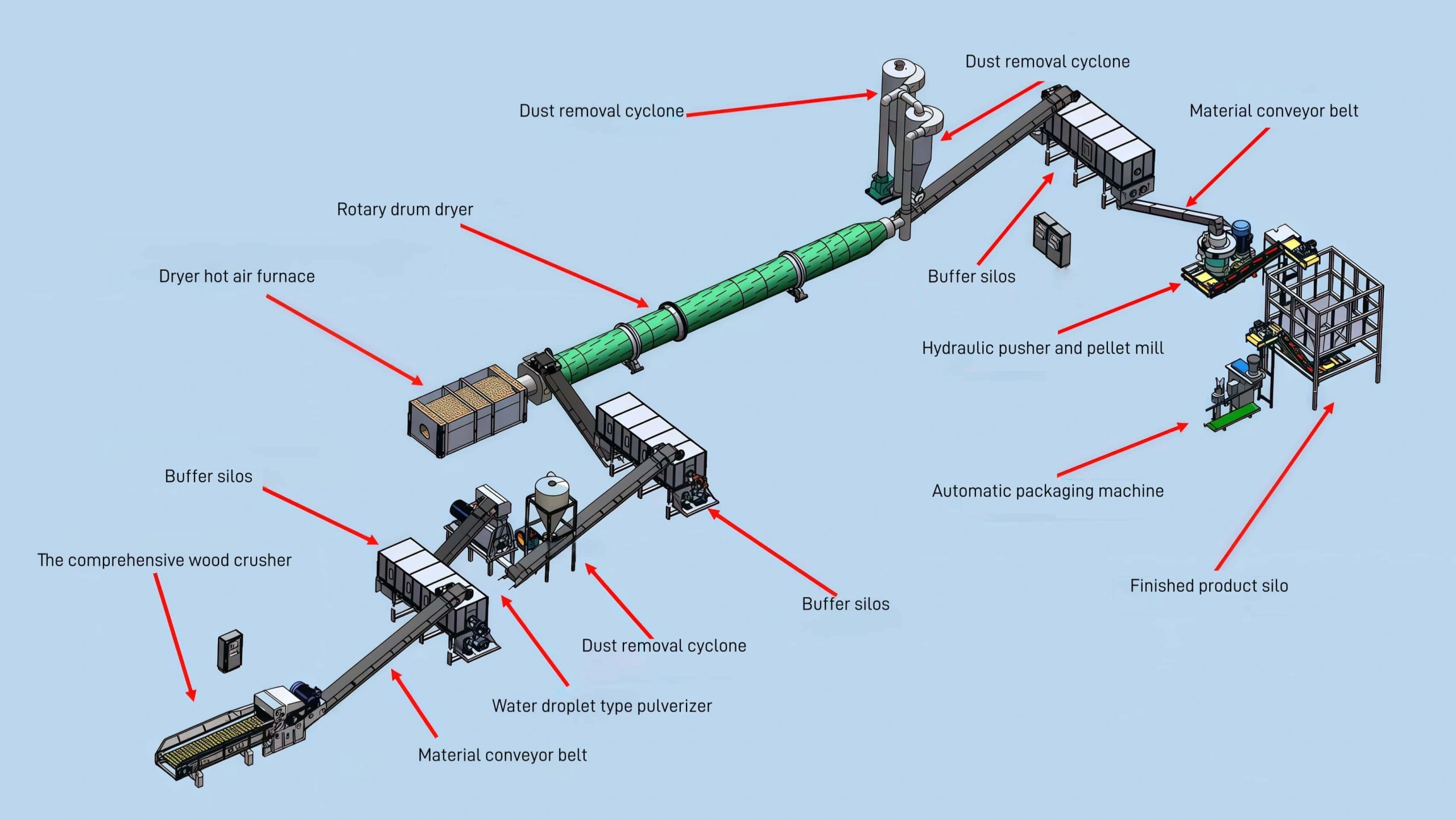 The dryer adopts a drum drying mode, using wind power to discharge raw materials with acceptable moisture content in sequence, ensuring effective use of heat source, and can increase output by 15% compared with traditional dryers. During the material collection process, gravity is used to separate impurities and metallic materials from the raw materials, thereby reducing the wear of the pellet mill during pelleting and reducing the ash content of the finished pellets.