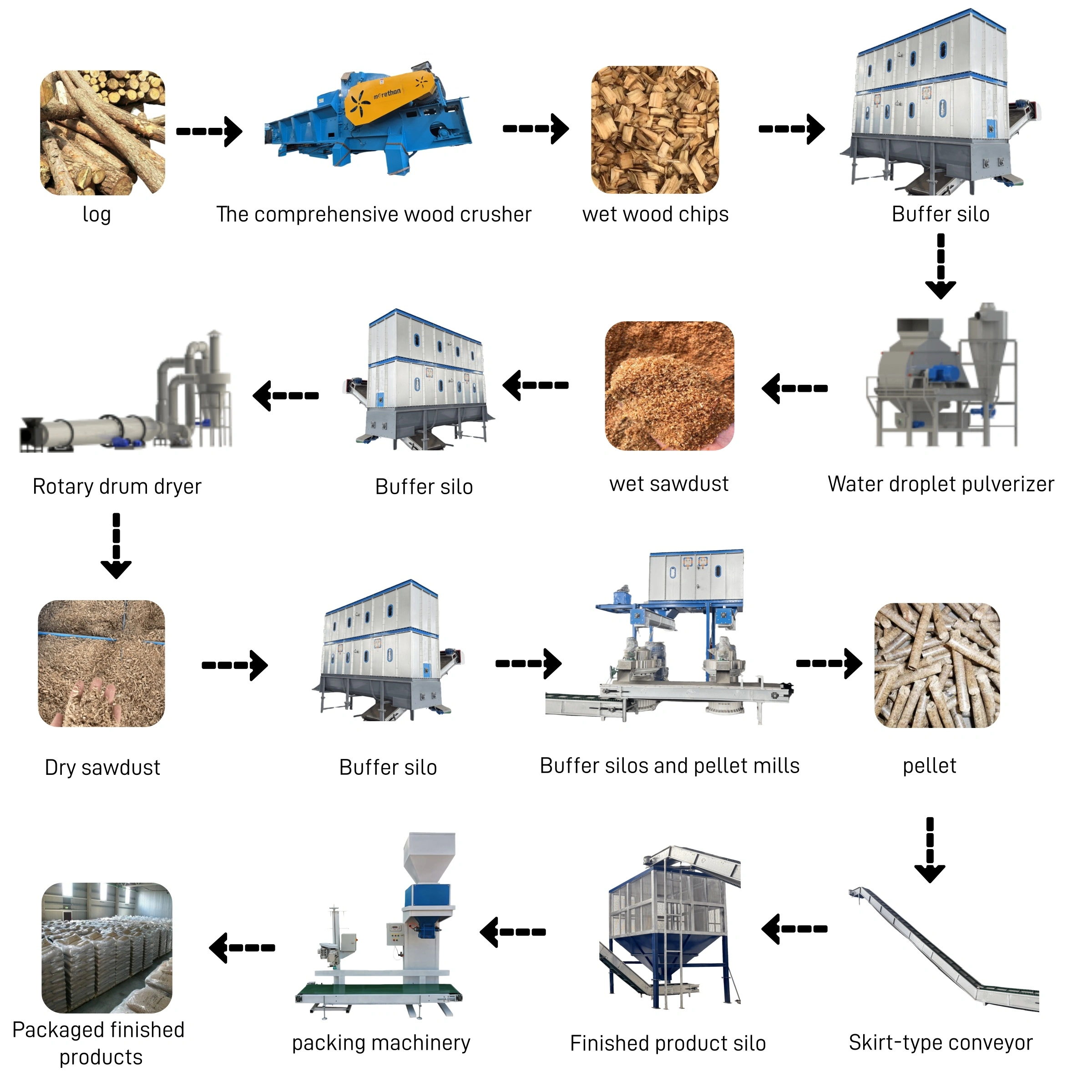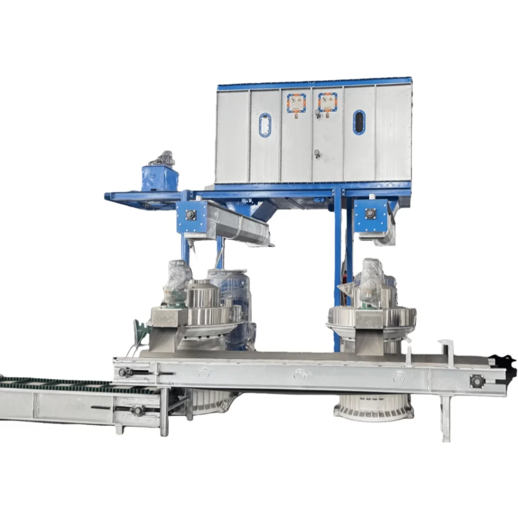 What you are seeing now is a complete 4-5 ton/hour automated biomass ring die pelleting production line. It includes a comprehensive crusher, wood chip hopper, water droplet pulverizer, sawdust hopper, drum dryer, dual-hopper feeder, two biomass ring die pellet mills, a cooling hopper, and a packaging machine. This system realizes the entire production process from raw material crushing, grinding, drying, pelleting, cooling to final packaging. The entire production line is designed to be automated, scientific, and continuous, producing high-calorific-value pellet fuel that is easy to store and transport. This production line has been exported to more than 50 professional biomass pellet energy plants worldwide.